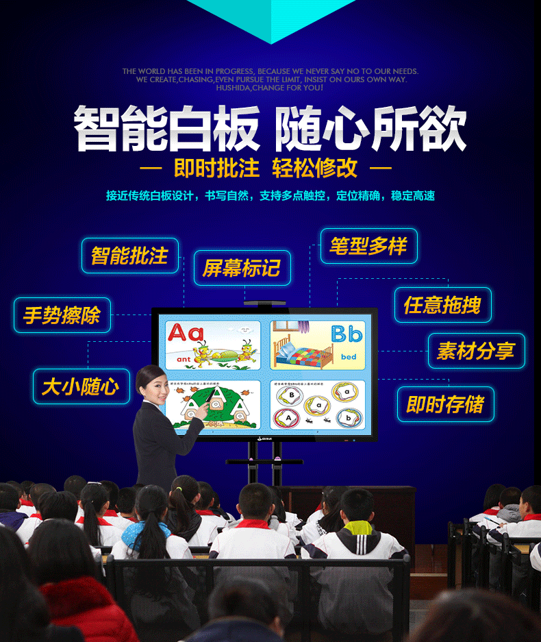 AW系列-多媒體教學一體機,高清大屏顯示,壁掛支架多種使用方式,人性化機型設計,立式與掛式兩種使用方法可交替使用,避免使用環境發生變化時產生的資源浪費問題采用LED背光源長壽命,低功耗,環保節能。智能電子白板,各種文件一鍵加載,多點觸控智能電子白板適用于各種商務會議,支持手寫批注,兼容日常office辦公軟件,本地、U盤、網盤、局域網數據輕松駕馭。書寫流暢,減少視覺誤差,高端企業必備,多重主題背景,筆形色彩,任意選擇。高端配置 讓運行速度,完美兼容WIN7,WIN8 隨意切換。