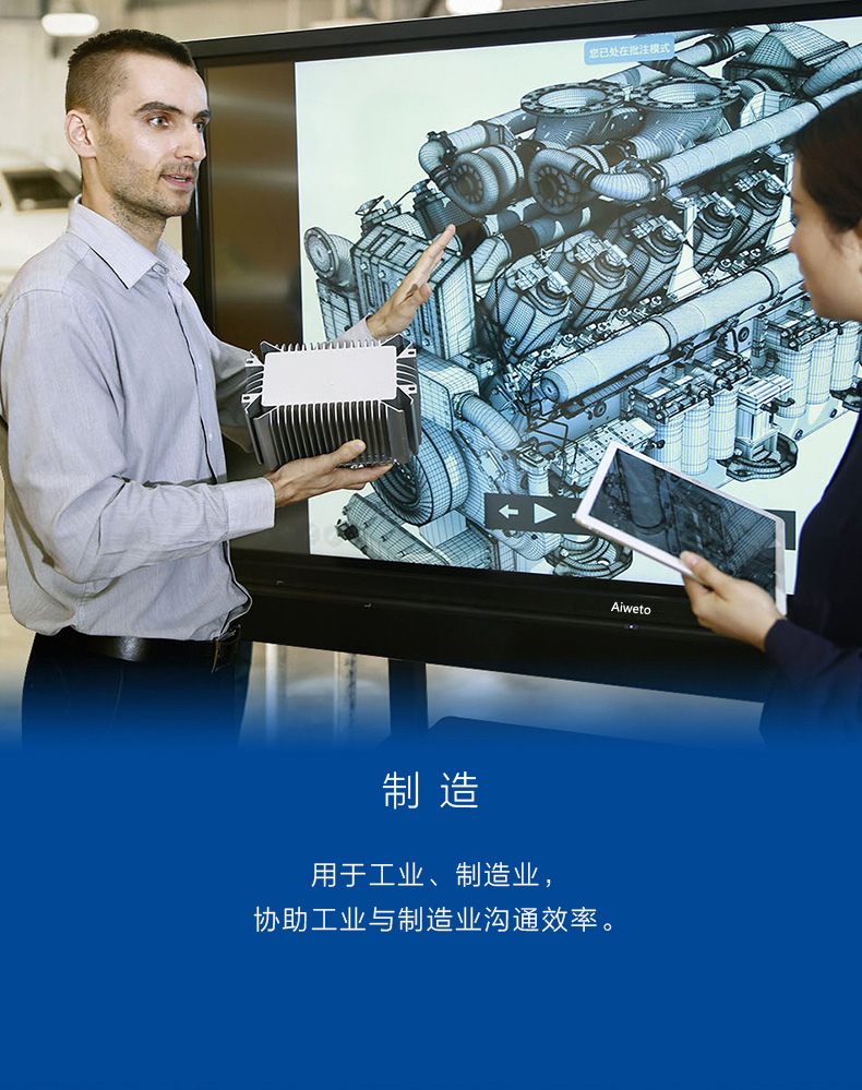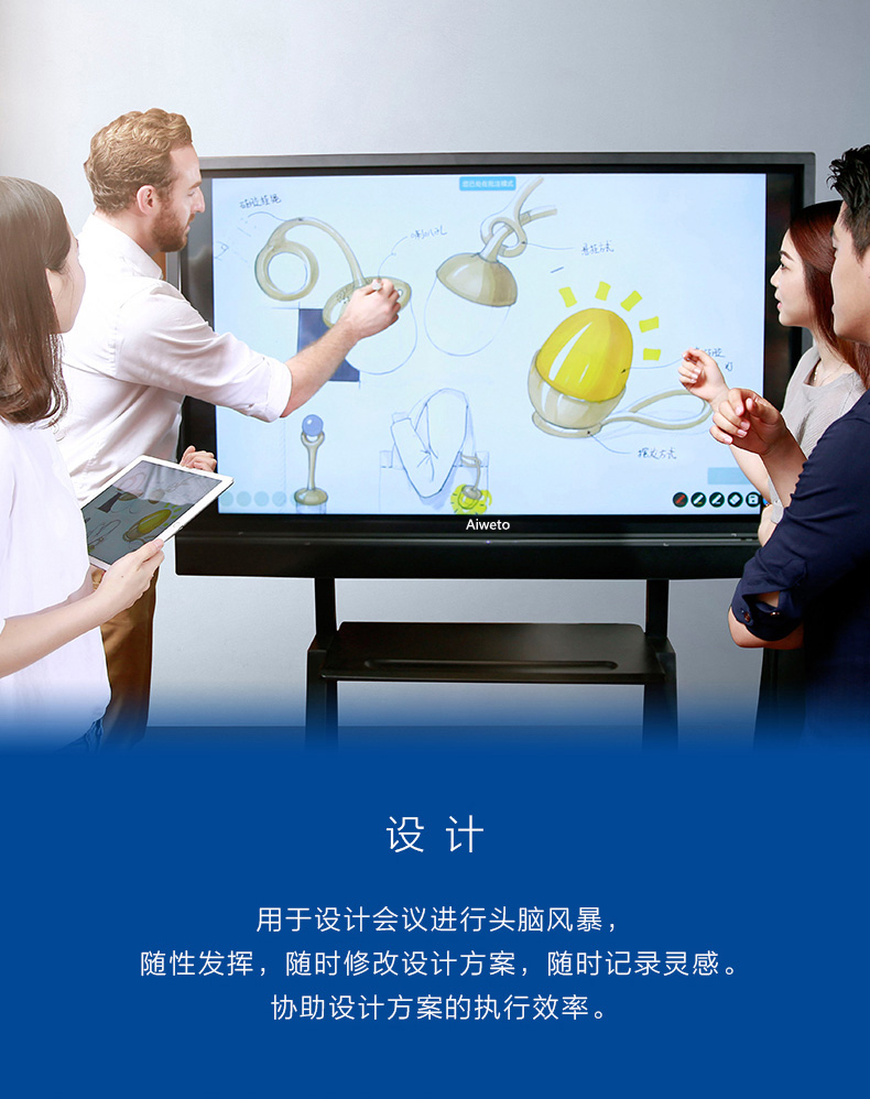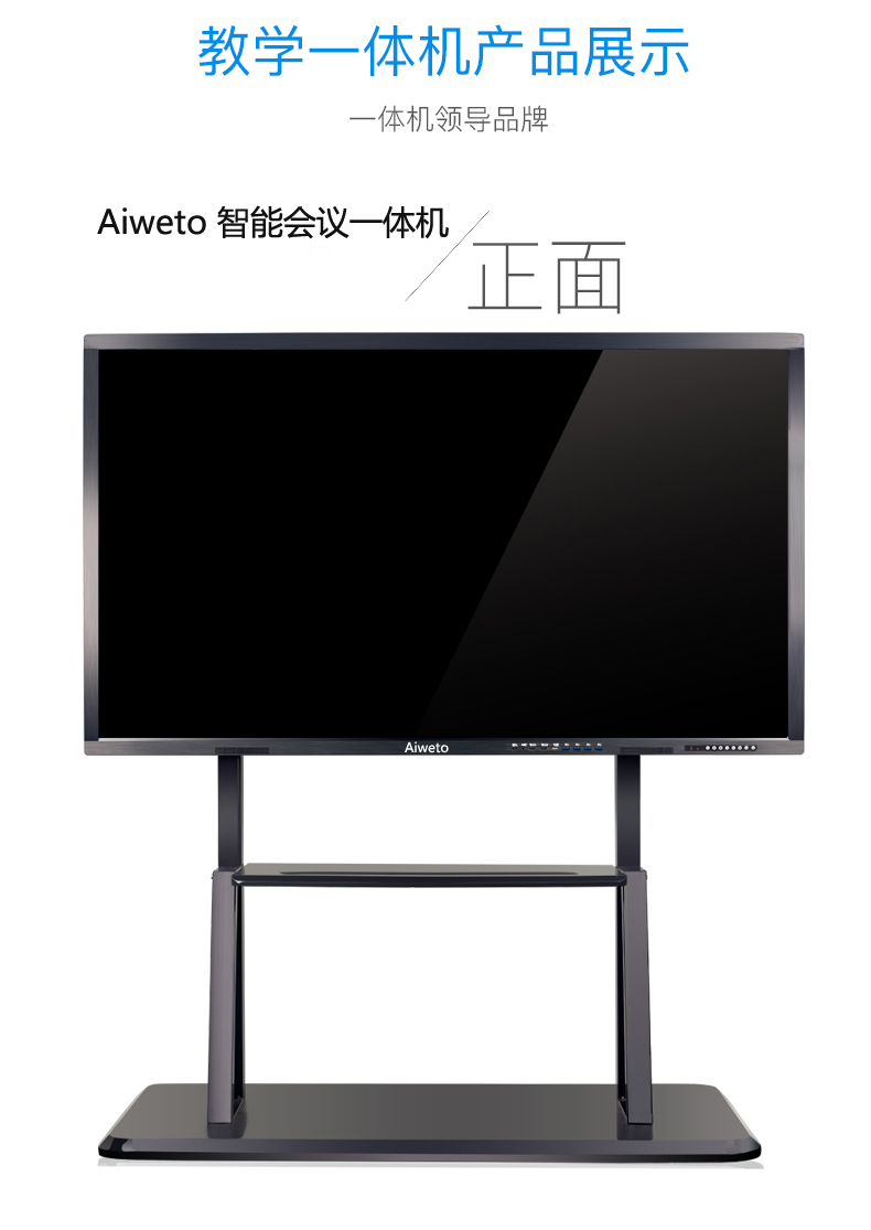 Aiweto(艾維圖)會議多媒體觸摸一體機采用LG商用IPS硬屏,全高(1920*1080)顯示,具有178度視角,高對比度和亮度,3D數字降噪,智能消除殘影、重影等失真現象,使得顯示畫面更清晰,穩定,色彩更鮮艷;